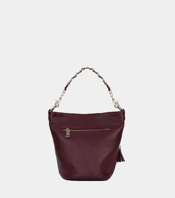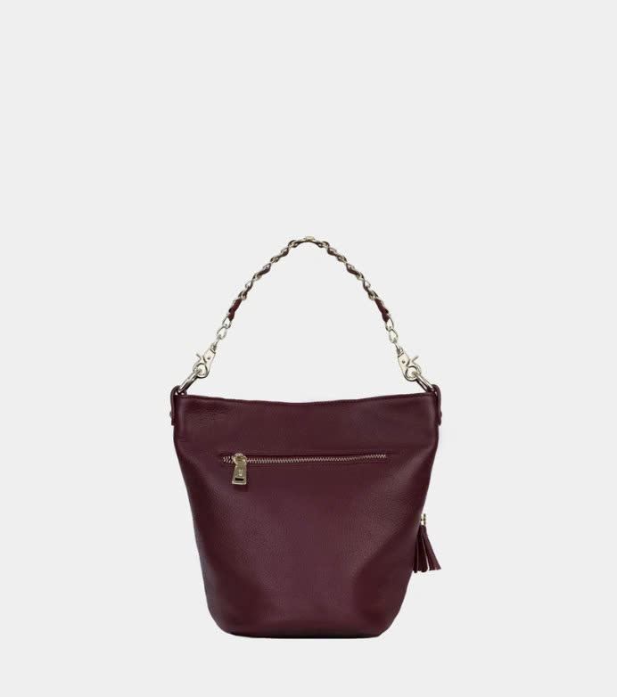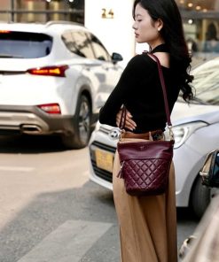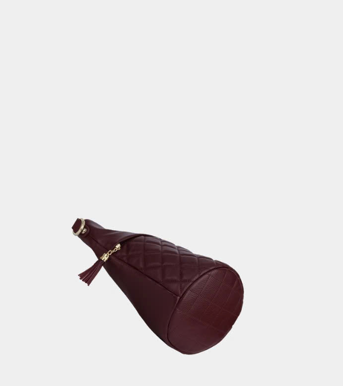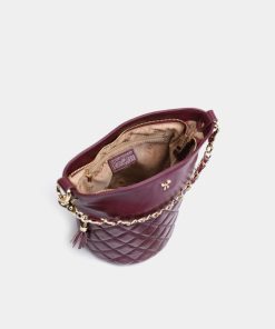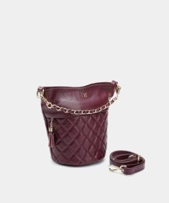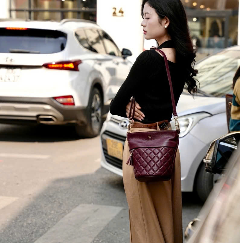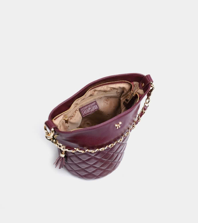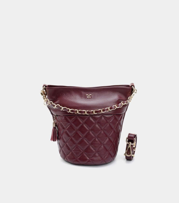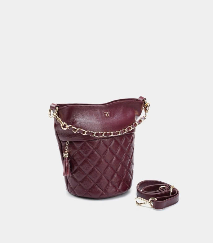 Túi bucket màu tím mận Cindy da thật thiết kế phần miệng túi kéo khoá mở rộng và sức chứa đồ đáng kinh ngạc. Hoạ tiết chần ô trám kết hợp dây xích phối giúp bạn nổi bật giữa đám đông