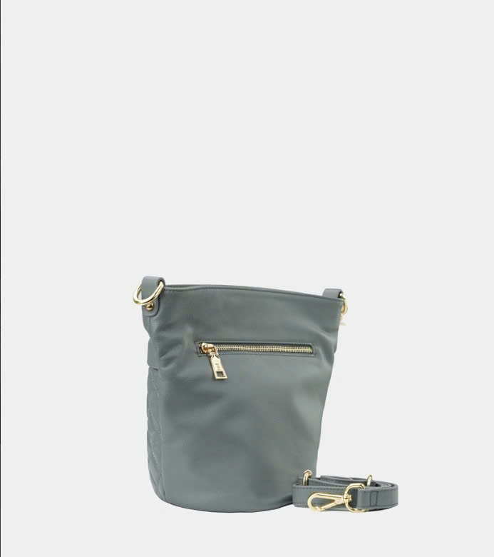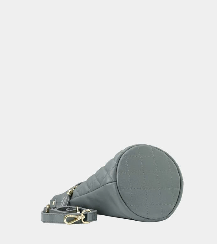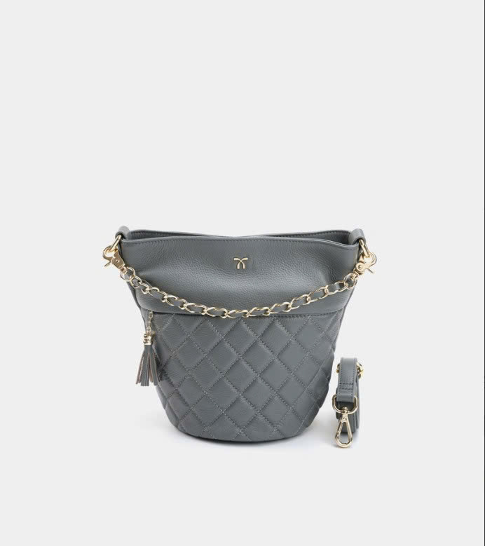 Túi bucket màu xám Cindy được chế tác từ da thật nguyên miếng, mang lại cảm giác mềm mại, thoải mái khi sử dụng nhưng vẫn giữ được độ bền và vẻ ngoài cao cấp. Sự kết hợp giữa da trơn mịn ở phần miệng túi và họa tiết chần ô trám tinh tế ở phần thân túi tạo nên điểm nhấn khác biệt, vừa hiện đại vừa cổ điển.